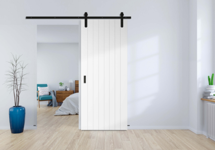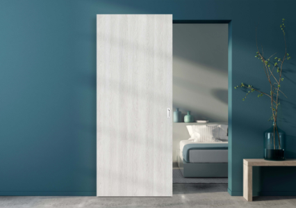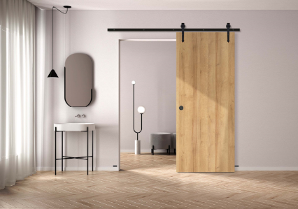 Bīdāmas durvis ar eko finiera apdari, kas pie sienas montētas ar LOFT RETRO un STANDARTA stila sliedi, ļaus izveidot šķūņa tipa bīdāmās durvis, kas šobrīd ir tik aktuāla interjera dizaina tendence. Minimālisma interjeros, kuros nav nepieciešamības pēc liekām detaļām, ir iespējams izmantot vizuāli telpā neredzamu sliedi MAGIC. Savukārt, bīdāmas durvis iekštelpām, kuru alumīnija kārbas konstrukcija ir iebūvēta sienā, ir lieliski piemērotas ļoti mazām telpām vai palīgtelpām, piemēram, garderobēm, vannas istabām un veļas telpām.